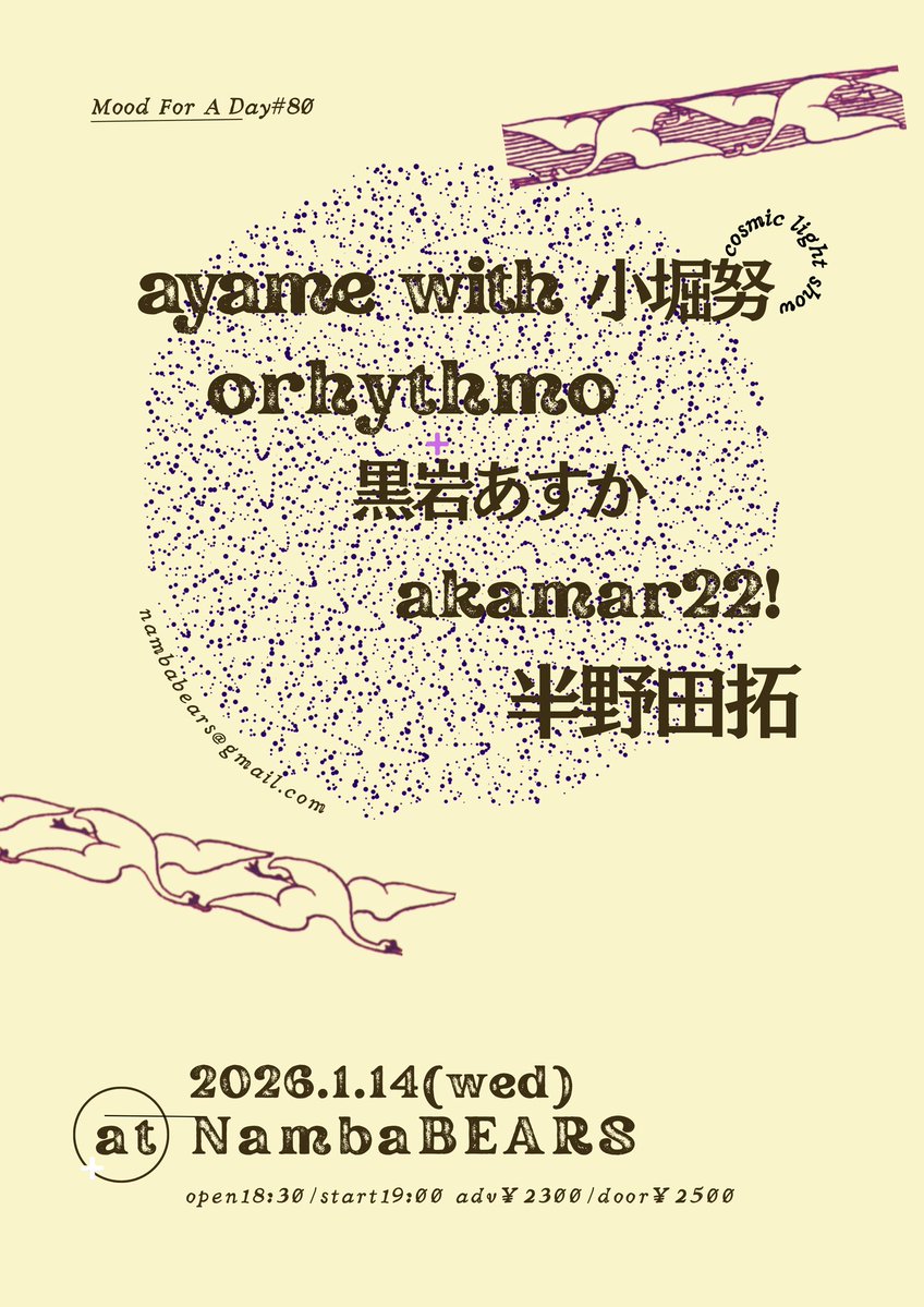 LIVE SCHEDULE 2026 1月14日(水) BEARS MFAD#80 open18:30 strart19:00 前売¥2300 当日¥2500 SOLO W / ayame with 小堀努(Cosmic Light Show)、akamar22!、orhythmo+黒岩あすか TOP